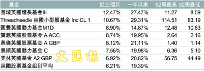 英股基金今年以來平均升幅更達19%,在成熟市場股票基金平均升幅僅遜於歐洲大陸核心單一國家股票(24.48%)、歐洲大陸股票(22.01%)以及包括英國的歐洲股票(20.42%)。
