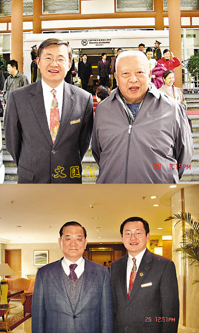 ■(上圖)肖君(左)在九寨溝喜來登酒店接待董建華。(下圖)肖君(右)在九寨溝喜來登酒店接待連戰。