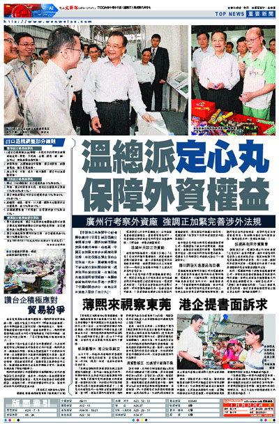 溫家寶於15日中午蒞臨廣州,立即在廣東省委書記張德江,省長黃華華陪同下,先後到廣州市多間合資和外貿企業參觀考察,了解生產、研發及經營情況。