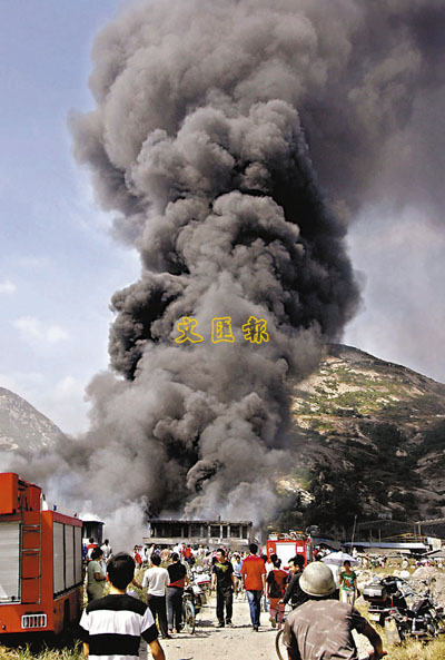 浙江省溫州市龍灣區獨山村一間造鞋原料廠起火後冒出大量濃煙。毗鄰兩間造鞋原料廠於17日清晨10時20分最先起火,消防員隨即趕赴現場將火撲熄。起火原因正在調查中,並無死傷報告。 新華社