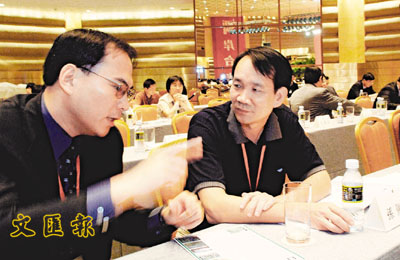 ■來自台灣台南縣的中國海峽兩岸農業協會副秘書長龔世明(左)和福建廈門市農學會秘書長孫傳芝在探討合作事項。 新華社