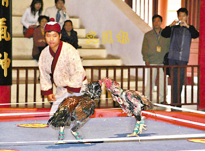 ■ 中國古代民間鬥雞遊戲再現開封。17日,河南開封清明上河園內,一場別開生面的中國古代民間傳統遊戲鬥雞表演吸引觀眾。這一中國古代民間傳統遊戲如今再現七朝古都開封。 中新社