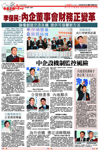 【本報訊】(實習記者 利建邦) 為期兩天的「應對資本市場變革 完善中企治理結構 香港高峰論壇」昨日圓滿閉幕。國資委研究中心副主任李保民指出,本次高峰論壇除為內地與香港企業、金融和證券機構,創造了直接交流的黃金機會之外,對提升中國企業公司治理結構,為下一步的企業改革、融資發展以及完善公司治理結構,也提供了可資借鑒的理論與實踐新方法、新途徑。