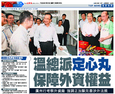 【本報珠三角新聞中心記者陳悅廣州17日電】趁百屆廣交會開幕之際,國務院總理溫家寶南來廣州考察。他透露,中國正在加緊完善涉外經濟法律法規,依法保護各類企業的合法利益。此外,溫總重申堅定不移地實行對外開放政策,提高利用外資的質量,注重引進先進技術和管理經驗。有觀察家認為此舉向外界進一步展示了中國的開放決心,並為合法外資進入發放「定心丸」。