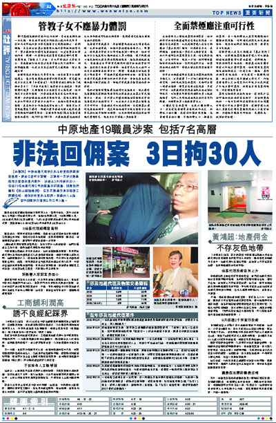 【本報訊】中原地產代理涉及非法收受回佣案有新進展。廉政公署昨日證實,正調查一宗涉及物業租用及買賣的貪污案件,於過去3天拘捕共30人,包括19名地產代理公司的職員和前僱員,懷疑他們觸犯《防止賄賂條例》,在多宗物業交易和租賃工商舖位時,提供和收受非法回佣。有業內人士指,事件懷疑涉及個別上市公司人員。