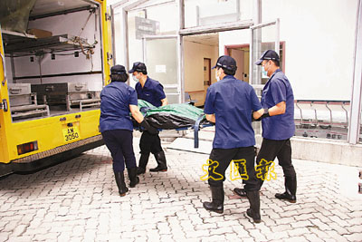 ■前騎師曾錦銓墮樓身亡,遺體由仵工舁送殮房。