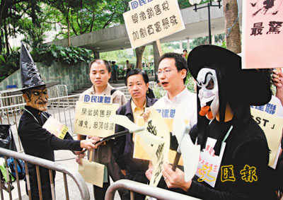 另外,多個團體到立法會門外請願,促請政府擱置引入GST。有請願人士更以一身萬聖節「嘩鬼」造型請願,諷刺政府開徵GST令市民「心慌慌」。