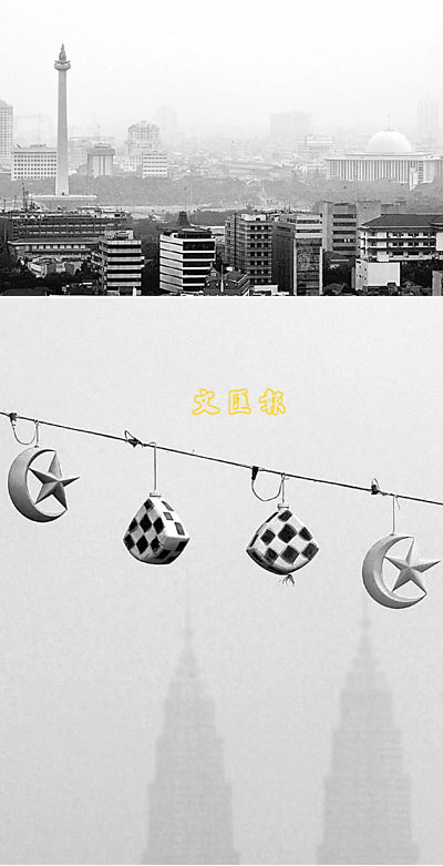(上圖)雅加達的天空被煙霧鎖住。印尼的森林大火不僅令全國的天空布滿煙塵,多間機場關閉,還影響到鄰國馬來西亞。(下圖)吉隆坡的標誌建築雙塔樓也成日籠罩在煙霧中。 法新社