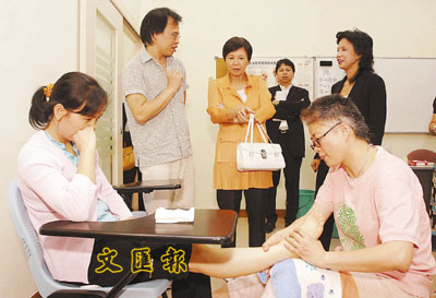 公務員事務局局長俞宗怡昨天下午到訪葵青區,了解該區市民生活及工作的情況。她參觀了香港專業教育學院(青衣分校)的多媒體及互聯網科技系的遊戲科技及視覺中心,並與約20名學生及畢業生暢談他們關注的課題,喜見去年該校畢業生的就業率高於90%。稍後,她又造訪香港聖公會麥理浩夫人中心,及葵青區諮詢服務中心,並到訪葵青區區議會,與區議員及其他地區人士茶敘,就地區事務交換意見。圖為俞宗怡參觀香港聖公會麥理浩夫人中心,了解足部按摩培訓班的上課情況。