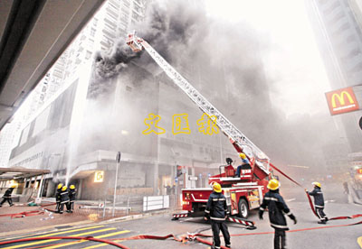 ■西灣河市政大廈地下熟食檔火警,大量濃煙經抽油煙機抽出街外後遮蔽上空,消防員正架雲梯灌救。 本報記者溫瑞麟 攝