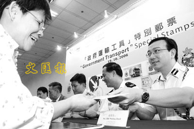 ■入境處助理處長趙偉佳為市民購買的《政府運輸工具》特別郵票上簽名。本報記者李志樑 攝