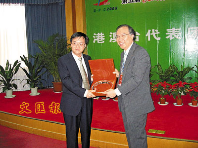 ■香港代表團團長、中大副校長鄭振耀(右)接受贈送紀念品。 本報記者于永傑 攝