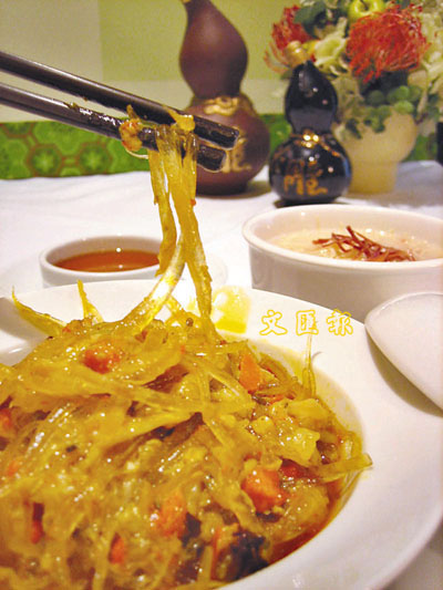 ■二@青片翅針,每條都粗壯得有如尾指。以鮮雞和雲腿等上乘材料燜製六小時,讓所有材料的精華,滲入每條魚翅之內。完成後,取走材料,將魚翅混入蟹粉燴煮。魚翅軟滑爽口,蟹粉甘香美味,加上秘製的醬料,每口都散發著豐腴的大閘蟹鮮味,是秋季必吃之選。(特價-$338/原價-$450)