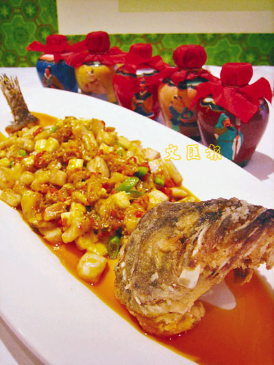 ■先揀選約一斤重的桂花魚,然後切除魚肚及去除魚皮,起肉後與蟹粉共炒。魚肉嫩滑,蟹粉甘香,再呷一口微凍白酒,更能帶出蟹及魚的原有鮮味。(特價- $360/原價-$480 *食客可選鹹水或淡水魚,但價錢有異。)