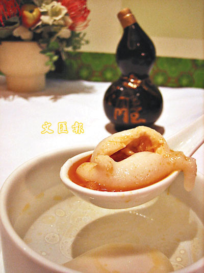 ■蟹粉小籠包,大家定必吃過,但蟹粉湯圓,則可能前所未聞!張師父表示,為保留小籠包的獨特口感,幾經研製,最後選用了湯圓,作為蟹粉的「表面」。由於上海有鹹味湯圓,故師父就想出以清湯伴底,以突出湯圓的味道。此菜的特別之處,是湯圓比小籠包更具口感,雪白無暇、形狀酷似魚形的「蟹粉湯圓」,內裡擠滿滾燙燙的蟹粉,入口漸漸融化,直流入胃,溫暖全身。(特價- $53位/原價-$70位)