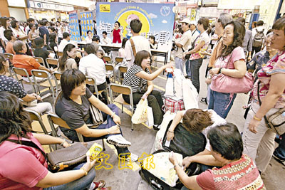 昨日在旺角街頭舉行特首選舉論壇,雖然席上主持、嘉賓喊得聲嘶力竭,仍然未見有太多市民參與,但就吸引了一批瘋狂購物後的女士,暫借大會的空凳坐一坐稍作「休息」,更爭取時間,把「戰利品」放入行李箱內,再輕鬆地離開。本報記者劉國權 攝