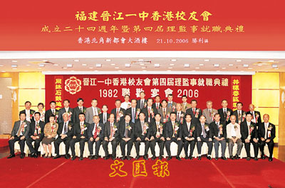 【本報訊】(記者 鄭群)福建晉江一中香港校友會成立24周年暨第4屆理監事就職典禮,日前假北角新都會大酒樓隆重舉行,蔡相如、莊文議、莊永耀分別榮膺校友會新一屆會長、理事長及監事長。家鄉、母校領導以及內地多個省市、海外晉江一中校友會紛紛組團來港慶賀,當晚賓主逾千人,歡聚一堂,暢敘同窗友誼,共話母校未來,場面盛大,喜氣洋洋!