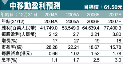 雖然中移動基本因素良好,但中移動股價自今年初已錄得61.04%升幅,料3G營運風險將成為投資者獲利回吐的藉口。我們對中移動評級為「持有」,目標價61.5元,相當於18.67倍06年及16.4倍07年預期市盈率。其過往五年歷史市盈率介於14.15-19.42倍。若中移動股價高於我們目標價61.5元(昨收59.15元),建議投資者可先行於高位獲利。潛在風險包括3G網絡建設等基建由中移動母公司承擔,將大大減少中移動前景發展之風險,有助穩定股價。