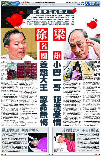 不同的商會領袖,同樣的命運遭遇。兩位受傷的男人——香港活家禽批發商會會長徐名團跟港九新界公共專線小型巴士聯合總商會主席梁雄,外表老氣橫秋,帶著在江湖打滾多年的滄桑,同是商會領導人,同樣曾經被斬,差點去見閻羅王。說起往事,他們感慨「出得薯獢A預鱄n還」,說得恐怖一點,只要涉及利益,就有衝突,一個商會,不過是一個社會縮影。兩宗相隔5年的斬人案,徐名團想起也驚,但梁雄揚言由小被人打大,未驚過。無論怕與不怕,他倆仍然甘心為其行業「賣命」。