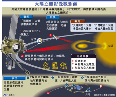 美國太空總署(NASA)計劃於當地時間昨晚8時38分(香港時間今晨8時38分)發射2枚衛星作「天眼」,再配合地球軌道上的偵察器,首度結合3個視點拍攝出立體的太陽照片,這將有助預警太陽風暴的來臨,減少對地球的影響。