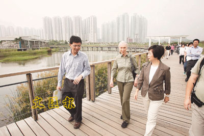 集保育、教育和旅遊於一身的香港濕地公園,自今年5月20日開幕後,每逢周六、日及公眾假期,每天2,500張團體票勢必售罄。環境運輸及工務局局長廖秀冬昨日陪同來自英國的保育學者珍古德,前往濕地公園參觀,更特意在開放時間前半小時進場,以便寫意地介紹港府在濕地公園內的工作,講解人工濕地的成效。