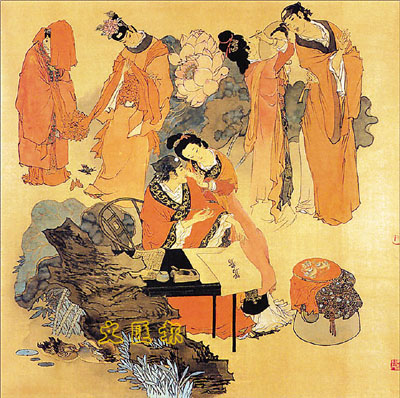 《世說新語》記載,溫嶠有一位姑母劉氏,家值亂離散。惟有一女,甚有姿慧。姑母囑托當時已經喪妻多時的溫嶠代為尋覓一門好親家。豈不知此時的溫嶠對美麗的堂妹早有了「多情誰似南山月?特地暮雲開」的心思,他問姑母:「佳婿難得,但如嶠比,云何?」現在好女婿難找啊,找個像我這樣的如何?姑母歎息道:「喪敗之餘,乞粗存活,便足慰吾餘年,何敢希汝比?」意思是,這戰亂年代人命危賤,能粗草生活就足以讓我很安慰了,哪裡還敢妄想找到像你一樣的人啊!過了數日,溫嶠便來向姑母報告喜訊說,已經找到一門好親事,對方出身門第粗可,現在也身居高官顯宦,一點不比他差。還帶來玉鏡台一枚做聘禮——其實這玉鏡台是溫嶠做劉越石長史時北征劉聰所得。姑母不知就裡,自然大喜過望。等到結婚當日,這位「甚有姿慧」、也許已從中悟出奧妙,識破天機的堂妹大膽地自己揭開遮面的紗扇,一看見新郎的真面目便「撫掌大笑」,並說:「我固疑是老奴,果如所卜!」一個真率可愛又聰慧過人的年輕女孩躍然眼前。
