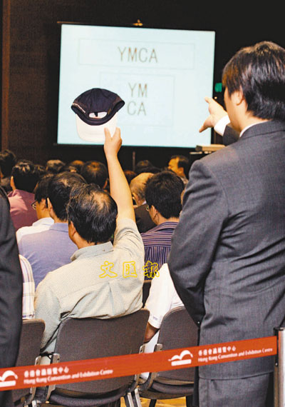 ■為求奪得心頭好,參與競投人士以帽子向拍賣官示意出價。本報記者潘政祁 攝