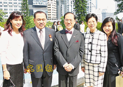 ■余國春(左二)獲頒金紫荊星章,與特首伉儷合影。 本報記者葉傲冬 攝