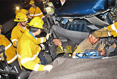 消防員接報到場先剪開車頂,再拆去車頭擋風玻璃,經約半小時將兩人救出,其中陳姓司機被救出時即告吐血,事後由救護車送院。