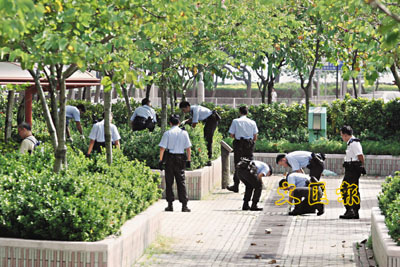 另一方面,警方昨晨9時許,出動數十名機動部隊警員重返現場,展開大規模搜集證據工作。由於公園面積廣闊,又多草叢,故搜索工作頗為困難,任何可疑之處都不放過,現場附近發現的不少啤酒罐、汽水罐、棄置衣物及大量煙蒂,幾乎全被警員檢走。