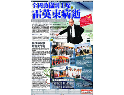 【本報訊】北京消息,全國政協副主席、本港知名人士霍英東先生,昨日傍晚七時許在北京因病逝世,享年八十三歲。國家主席胡錦濤、國家副主席曾慶紅,以及多位政要,日前曾到北京醫院探望霍英東先生。