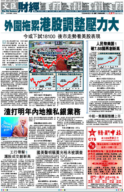 美股上周五急跌73點,令亞太區股市昨日普遍下挫,星、馬、台、韓等地的股市都疲軟,而日股更大跌317點,跌幅近2%,港股雖然昨日休市,但亞太區股市的不濟表現,或多或少會影響今日港股的走勢。有分析員指,若今晨美股未能止跌回升,以港股上周五創新高後突然轉勢、倒跌收場的表現來看,恆指今日將下試10天平均線支持、即18100的水平;如果超過這個跌幅,更可能觸動程式沽盤及期指淡友的猛烈「空襲」。 ■本報記者 周紹基