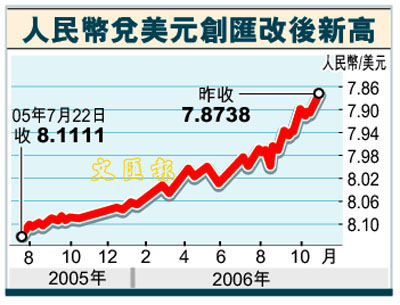 【本報訊】(記者 何麗琪)人民幣匯價經過兩周以來的溫和回調,近期再度顯示出強勁的「加速跑」勢頭。在美元匯價轉弱下,人民幣兌美元匯價連續四日創匯改以來新高,昨日更升破7.88關口,人民幣匯率開市中間價開出7.8781兌1美元刷新新高紀錄,其後持續走高,曾高見7.8737兌1美元,較上日收市升156點子,收市報7.8738兌1美元,中間價及收市價均創新高。去年匯改以來人民幣匯率累計升值已超過2.94%。
