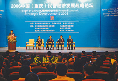 來自北京、溫州、河南、天津、江蘇等地的民企老闆以及政府高官和專家學者日前齊聚重慶,參加由中華全國工商聯合會、重慶市委、市政府聯合主辦的2006中國(重慶)民營經濟發展戰略論壇。