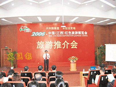 ■為推動「紅三角」旅遊經濟發展,贛、粵及湘共同簽署了《「紅三角」整體旅遊形象宣傳合作協議》。圖為旅遊推介會現場。本報記者朱瑩瑩 攝