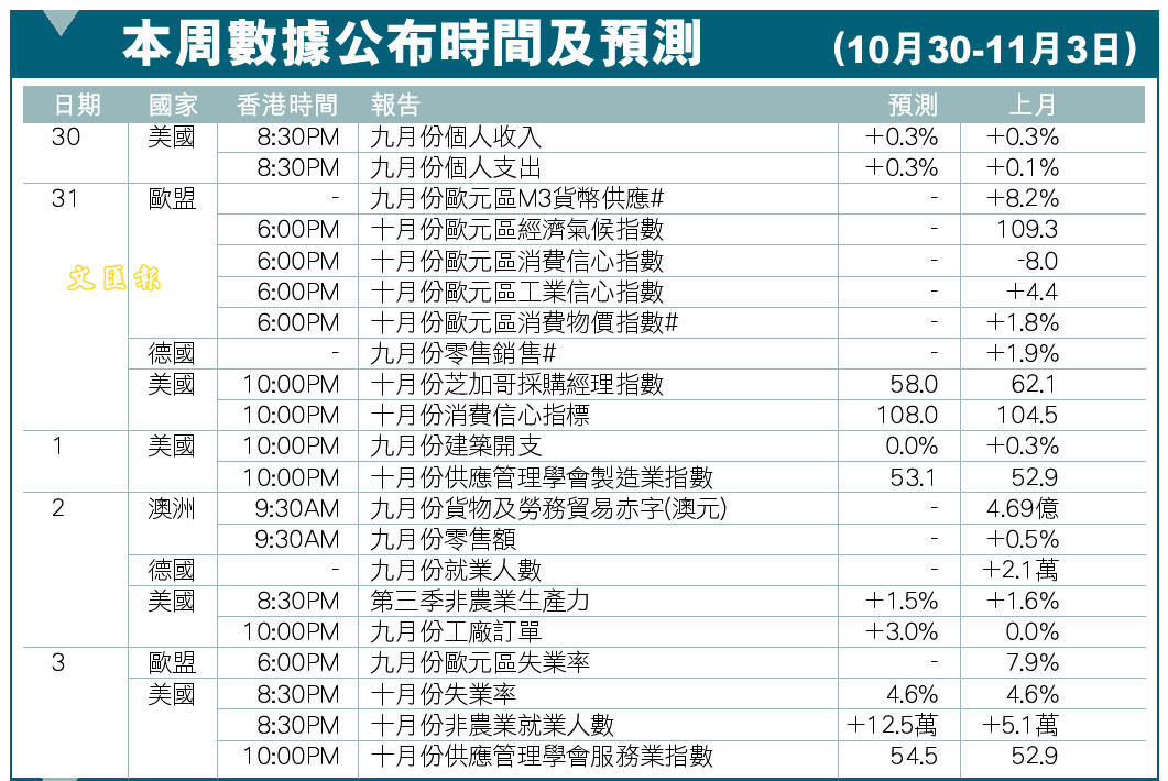 本周數據公布時間及預測(10月30-11月3日)