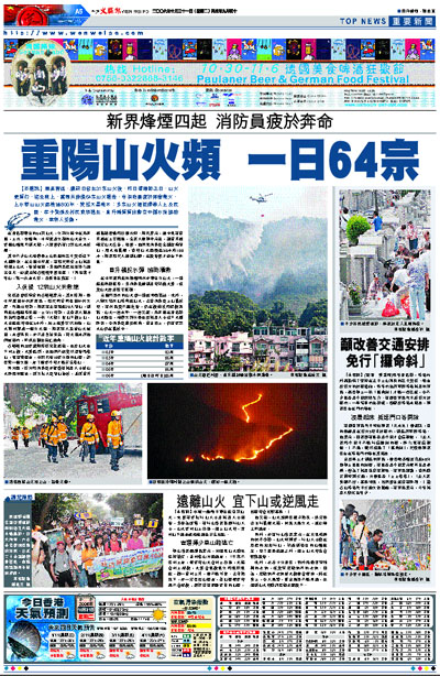 【本報訊】風高物燥,繼前日發生31宗山火後,昨日重陽節正日,山火更頻仍,迄至晚上,當局共接獲64宗山火報告,令消防員疲於奔命救火,上水華山山火面積達800米,焚毀大量樹木;多宗山火逼近掃墓人士及民居,孝子賢孫及村民狼狽逃生,直升機頻頻出動空中擲水彈協助救火,幸無人受傷。