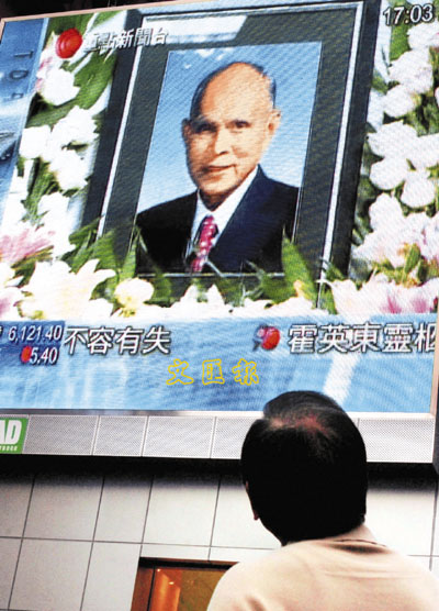■全國政協副主席霍英東靈柩覆蓋著國旗,於昨午由專機運回香港。香港多家電視台播放這一新聞,市民通過大屏幕,關注這一消息。 中新社