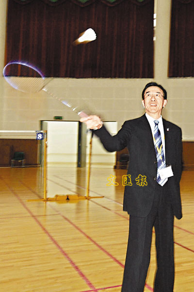 ■自由黨主席田北俊喜愛打波,圖為早前率團訪京時,一時技癢,拿起球拍與張宇人對打。 資料圖片