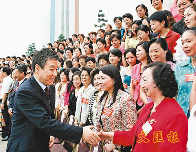 ■福建省委書記盧展工(左)與香港代表團代表親切握手。