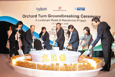 【本報訊】(記者 梁悅琴)新鴻基地產與新加坡嘉德置地合作發展的新加坡烏節路之標誌建築及嶄新概念Orchard Turn地產發展項目昨日早上正式動土,該項目位處烏節路及Paterson Road交界的主要商業及購物區,是新加坡其中一項最受注目的大型零售及豪華住宅項目,落成後進一步強化該區為世界頂級購物街之一的地位,更將烏節路重新打造成具活力的國際都會名街。