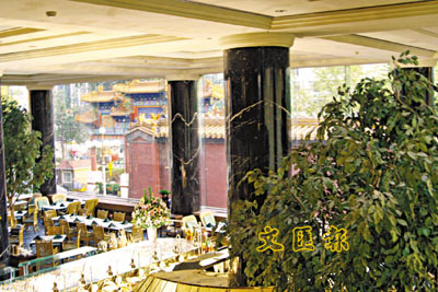 記者在現場看到,該玻璃高約5米,寬約1米,為左數第四塊,透過玻璃,可清晰看到寫有「貴賓樓」三個大字的牌坊。