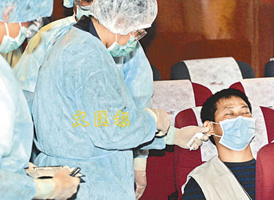 ■演習中,衛生署港口衛生人員為出現禽流感病徵的病人探熱。本報記者高仲明 攝