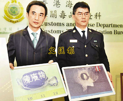■海關展示搜出的海洛英陳皮梅。 資料圖片