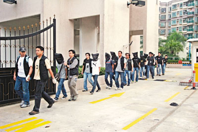 警方消息又稱,反黑組及特職隊共15名男女探員,昨凌晨3時,突擊搜查洪水橋紫翠花園第3座目標單位,拍門聲稱:「警察,開門。」只聽到屋內人大叫:「有差人呀!」但無人開門,探員即破門入屋,發現7名男子坐在8台電腦前,有所動作。