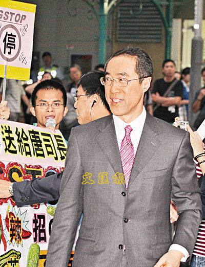唐英年昨日到荃灣出席最後一場地區稅制改革諮詢論壇,就現場所見,在最後一場地區諮詢中,無論場外的示威人數及場內的參與人數較前3次大幅減少。