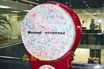 ■微軟中國研發集團年初成立時,所有員工都在這個中國大鼓上簽名留念,當中不少是港人。 本報北京傳真