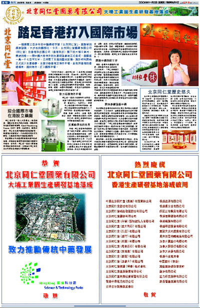 一個經歷三百多年的中醫藥老字號「北京同仁堂」,面對新的經濟發展,大步走向國際化。今天,北京同仁堂國藥有限公司(同仁堂)在香港科技園公司(香港科技)旗下的大埔工業村,興建的唯一一間中國大陸境外的生產研發基地正式落成,面積達一萬一千七百平方米,已添置了先進的器材設備,預計明年開始正式投入生產銷售,主要分銷香港及海外市場,並利用香港的優越環境,面向海外,打入國際市場。