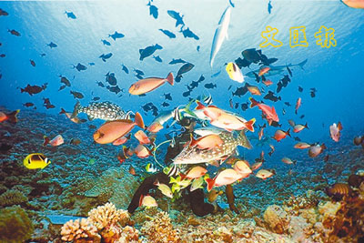 ■人類過度捕捉魚類,令產量大跌。圖為1海洋生物家在珊瑚礁中與海魚嬉戲。 網上圖片