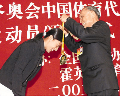 ■霍英東於2002年向冬奧取得金牌「零的突破」的短道速滑好手楊揚頒發純金金牌。 中新社